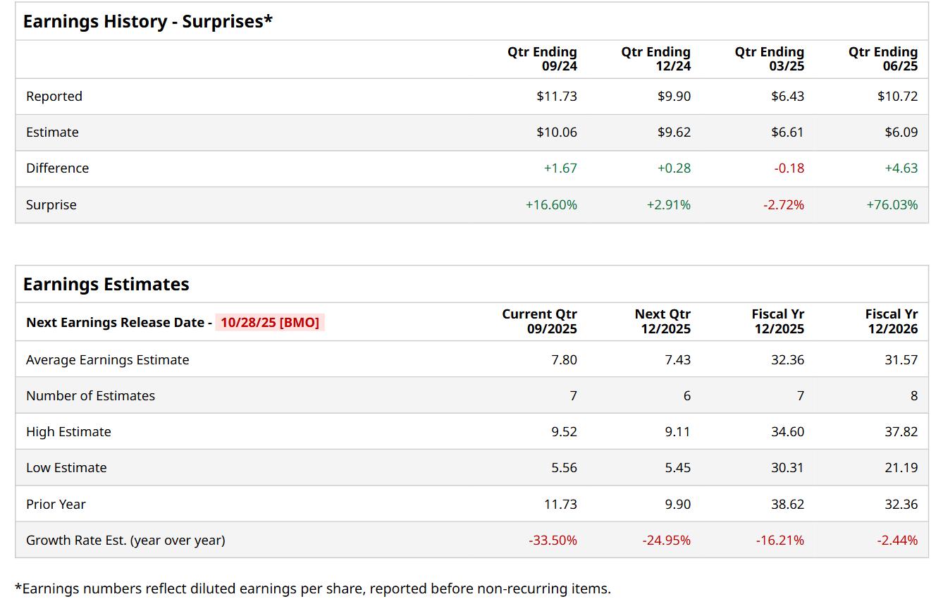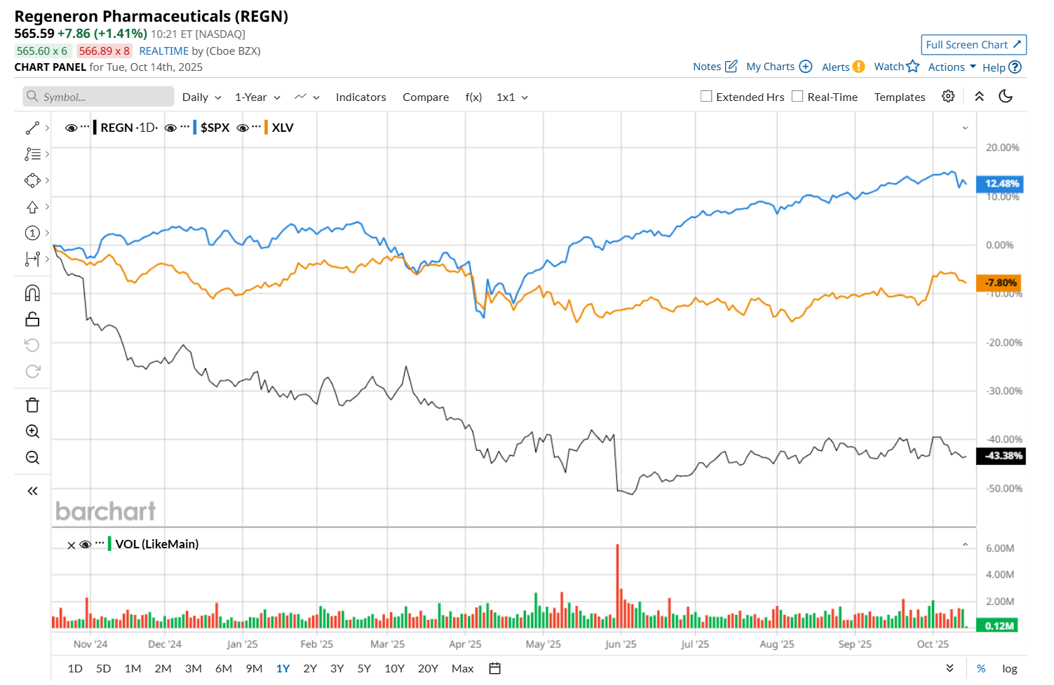 Regeneron’s Q3 2025 Earnings: What to Expect![]() Tarrytown, New York-based Regeneron Pharmaceuticals, Inc. (REGN) is a biotechnology company that invents, develops, manufactures, and commercializes medicines aimed at treating serious diseases across multiple therapeutic areas. Valued at a market cap of $59.1 billion, the company is expected to announce its fiscal Q3 earnings for 2025 before the market opens on Tuesday, Oct. 28. Before this event, analysts expect this healthcare company to report a profit of $7.80 per share, down 33.5% from $11.73 per share in the year-ago quarter. The company has surpassed Wall Street’s bottom-line estimates in three of the last four quarters, while missing on another occasion. Its earnings of $12.89 per share in the previous quarter outpaced the consensus estimates by a notable margin of 60.5%. For fiscal 2025, analysts expect REGN to report a profit of $32.36 per share, down 16.2% from $38.62 per share in fiscal 2024. Its EPS is expected to further decline 2.4% year-over-year to $31.57 in fiscal 2026. ![]() REGN has declined 44.9% over the past 52 weeks, significantly lagging behind both the S&P 500 Index's ($SPX) 12.3% return and the Health Care Select Sector SPDR Fund’s (XLV) 8.6% drop over the same time frame. ![]() Shares of REGN surged 2.5% after its better-than-expected Q2 earnings release on Aug. 1. The company’s overall revenue improved 3.6% year-over-year to $3.7 billion, exceeding analyst expectations by 10.2%. Furthermore, its adjusted EPS came in at $12.89, up 11.5% from the year-ago quarter and a notable 60.5% ahead of consensus estimates. Wall Street analysts are moderately optimistic about REGN’s stock, with a "Moderate Buy" rating overall. Among 27 analysts covering the stock, 18 recommend "Strong Buy," two indicate "Moderate Buy," six suggest "Hold,” and one advises a "Moderate Sell” rating. The mean price target for REGN is $729.85, implying a 29.5% potential upside from the current levels. On the date of publication, Neharika Jain did not have (either directly or indirectly) positions in any of the securities mentioned in this article. All information and data in this article is solely for informational purposes. For more information please view the Barchart Disclosure Policy here. |